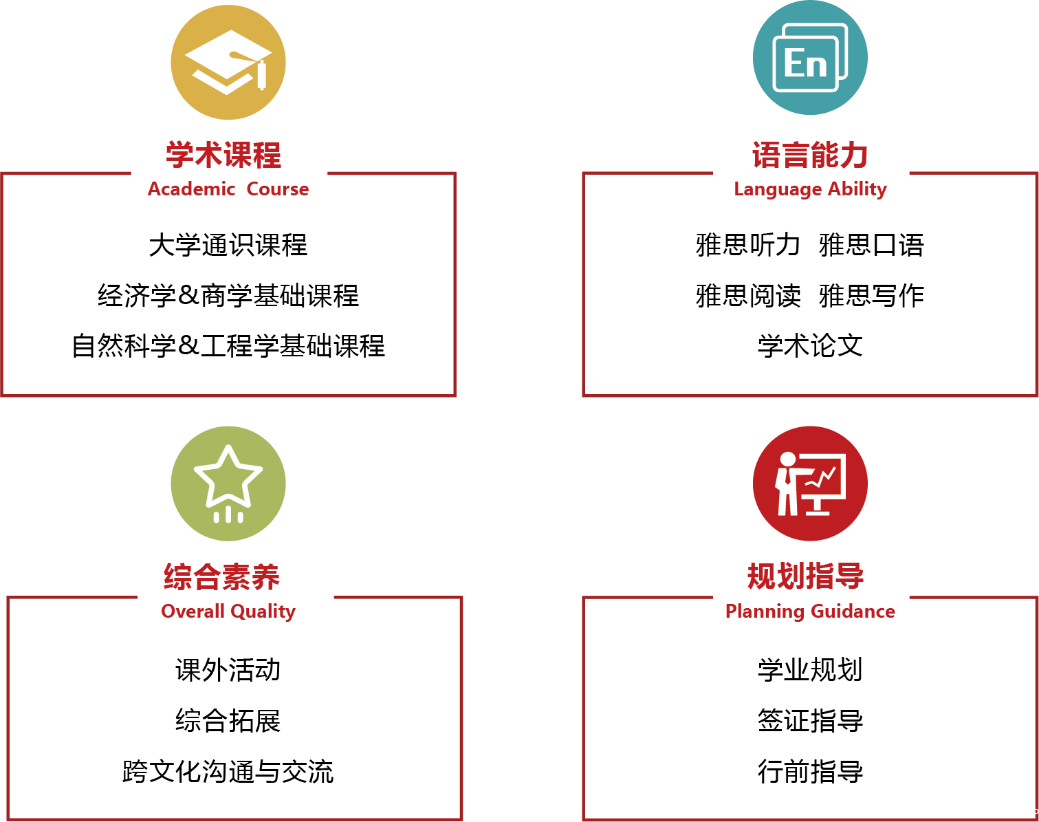 山大中加项目学制两年,开设了经济学与商学、工程与自然科学两大学科方向,每个学科提供约60学分的大学基础课程,如:微分学、积分学、社会学、物理学、计算机基础、微观经济学理论、国际经济学等,课程设置科学规范,专业涵盖广泛,使学生充分享受国际标准的高层次教育。