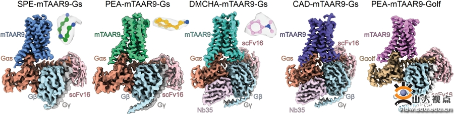 图一 不同配体结合的小鼠嗅觉受体mTAAR9与Gas及Gaolf蛋白三聚体复合物的结构